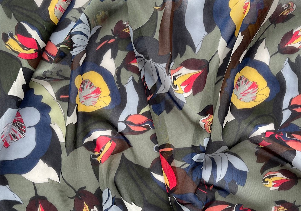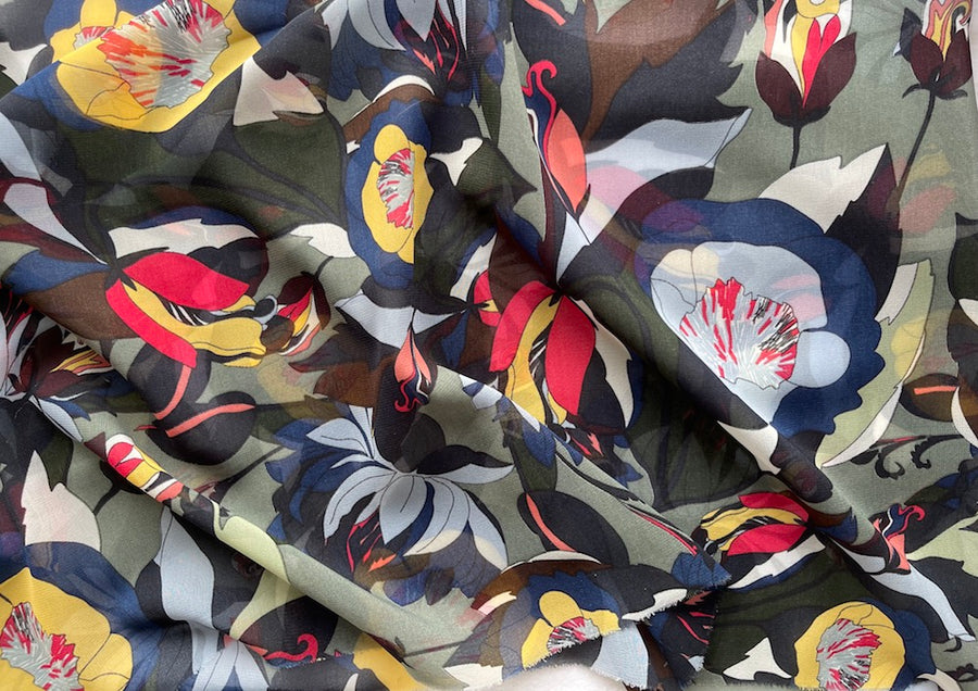 A semi-sheer polyester chiffon in a floral print of poppies, tulips and other blooms in rich shades of shrimp, coral, bright navy, cornmeal, sage, and olive - wonderful for a summer sundress, a peignoir, or a carefree scarf. Made in Italy. 100% polyester. 58" wide.