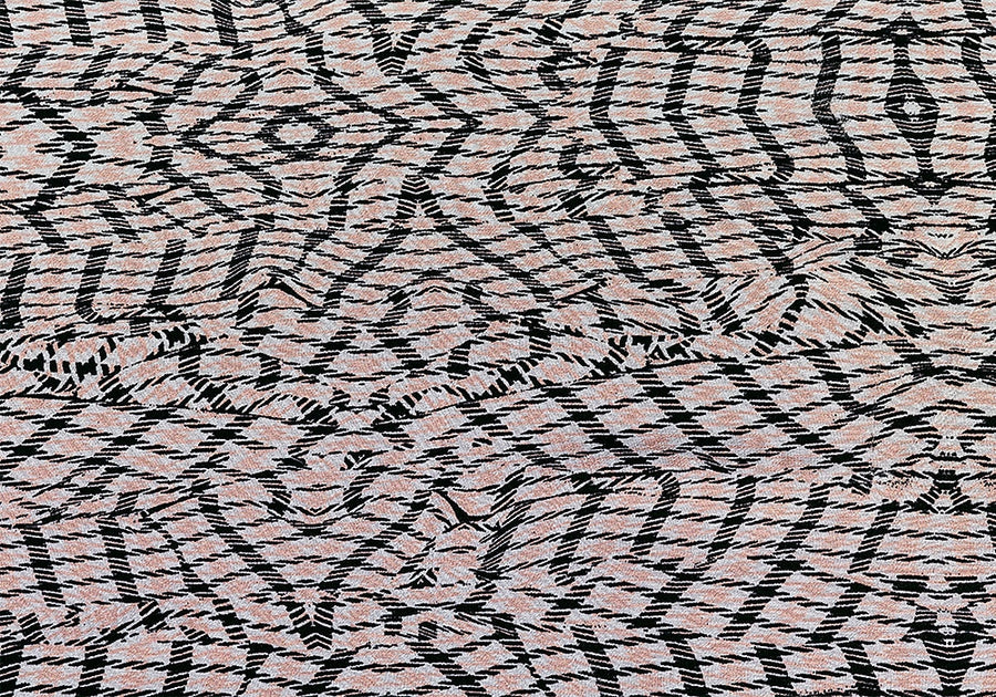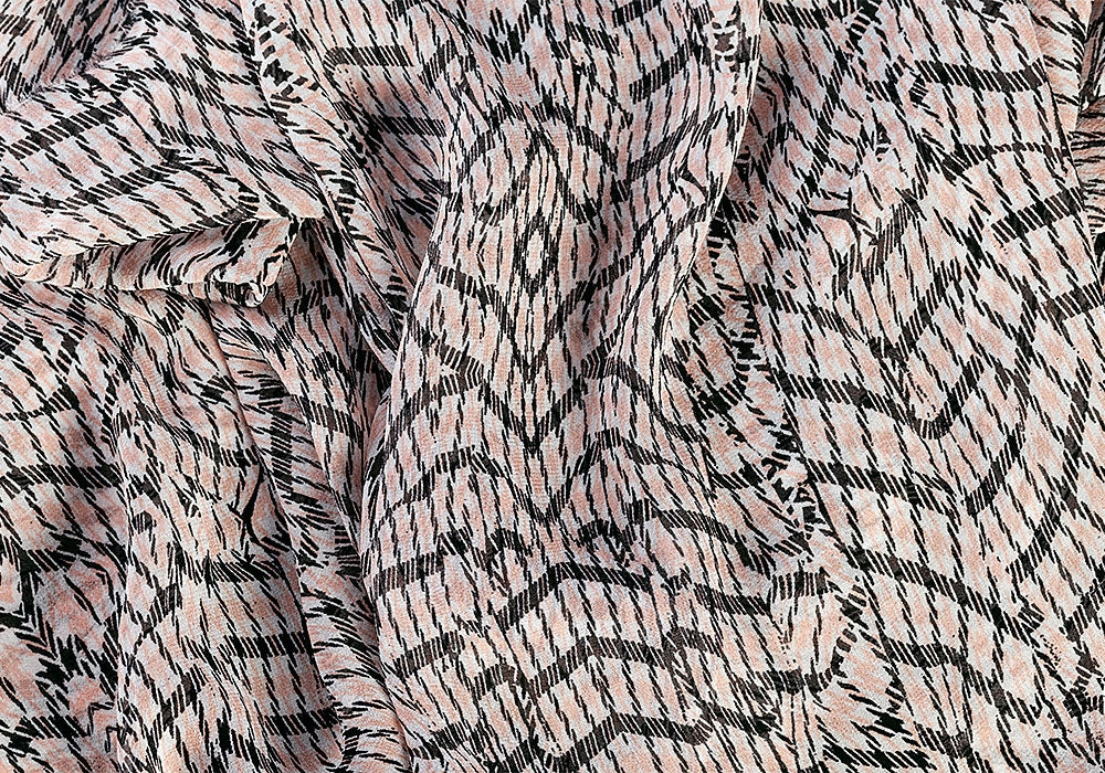 A sheer silk chiffon in a geometric print of crumples plaid lengthwise stripes in shades of blushing peach, white, and black - great for an elegant wrap or a glamorous blouse. Made in Italy. 100% silk. 57" wide.