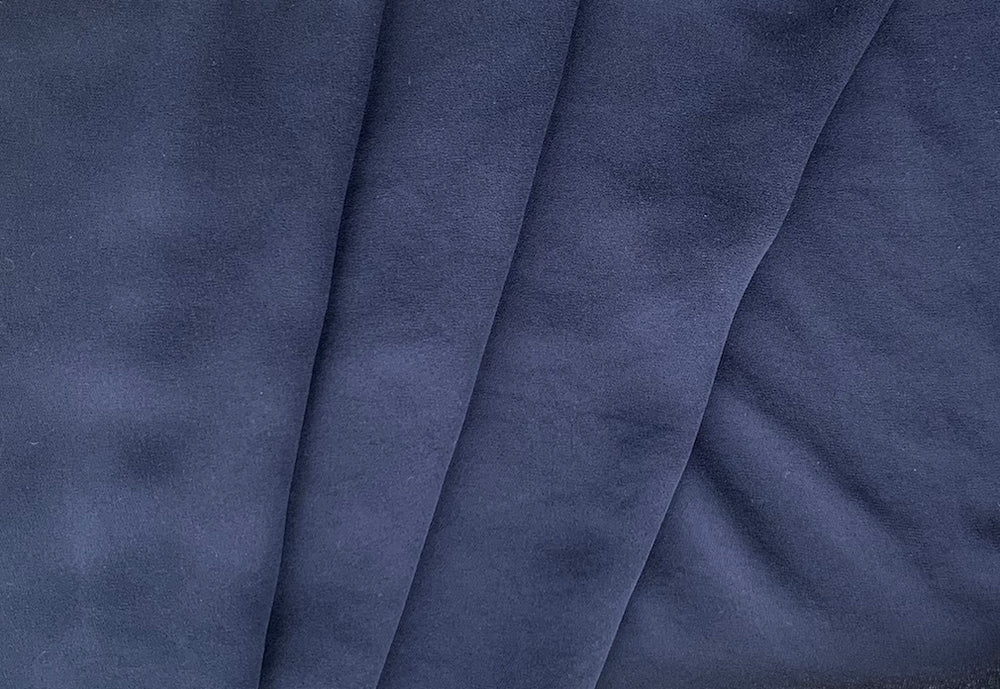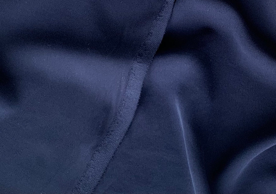 A stretch silk crepe de chine in bright navy - with a touch of lycra and a crepe weave, this stretch silk is perfect for a blouse, lined palazzo pants, or a pair of lux pajamas. Made in Italy. Silk and lycra blend. 50" wide.