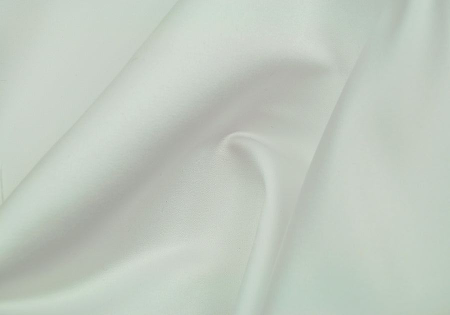 A luxurious polyester duchess satin in bright white, heavy and with a soft sheen - perfect for a bridal gown or a prom dress. 100% polyester. 60" wide.