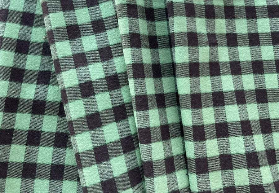 A butter-soft cotton flannel shirting in a 1/2" black and pistachio check - this brushed, tightly woven flannel shirting is perfect for shirts, skirts, dresses, robes, or cushy pajamas. Made in Italy. 100% cotton. 60" wide.