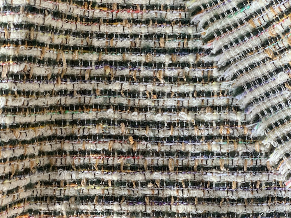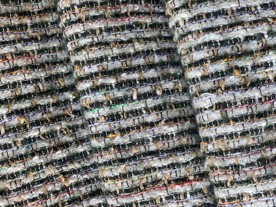 An elegant cotton blend tweed bouclé in camel, black, and natural, accented with hints of lilac, mint, and coral - with a faux raw silk texture, this fabric is absolutely fabulous for a sheath dress or a chic couture-style jacket. Made in Italy. Cotton, polyester, and wool blend. 60" wide.