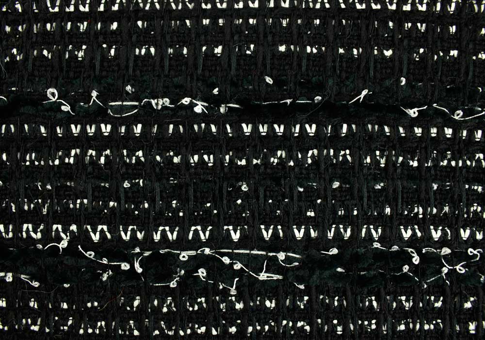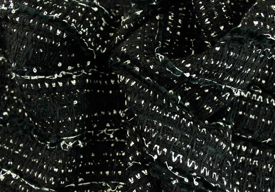 A chic wool blend bouclé in black and white, with black chenille accents running crosswise - perfect for a French, high end, couture-style jacket. Made in Italy. Wool and polyester blend. 55" wide.