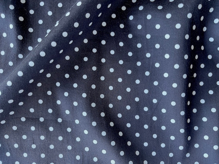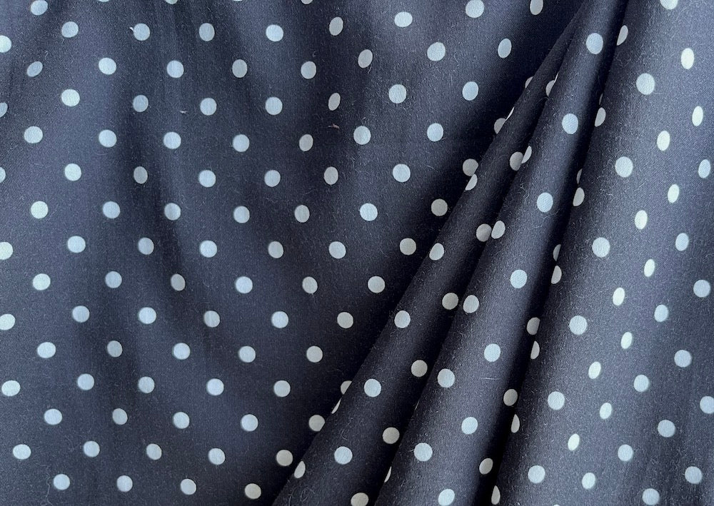 A fine stretch cotton sateen with mid-sized white dots on a black background - with a hint of lycra, this cotton is great for a sundress, a playsuit, or capri pants. Made in Italy. 96% cotton and 4% lycra blend. 60" wide.