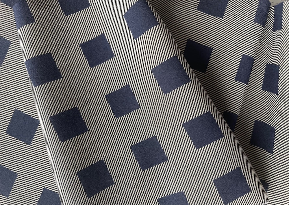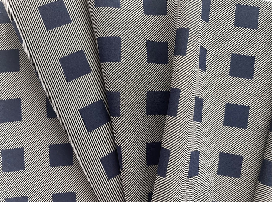 A silk crepe de Chine in an ivory and navy stone gridded geometric print - this elegant silk crepe de chine is perfect for a blouse, pleated dress, an accent scarf, lining, or lounge-wear. Made in Italy for a well-known high-end Italian designer. 100% silk. 55" wide.