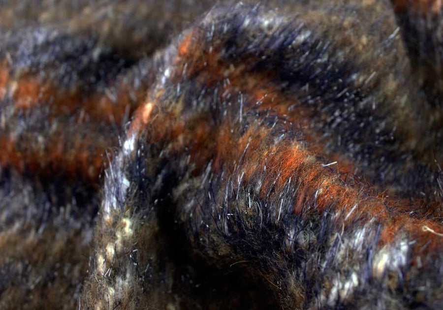 A couture fashion soft wool blend with a large-scale subtle plaid in shades of rust, metallic blue, brown, and ivory...and with a wee metallic touch. This is perfect for a French, high end, couture-style jacket or a hip-length cape. Made in Italy. 48% acrylic, 20% wool, 16% polyester, 14% nylon, and 2% other fibers. 62" wide.