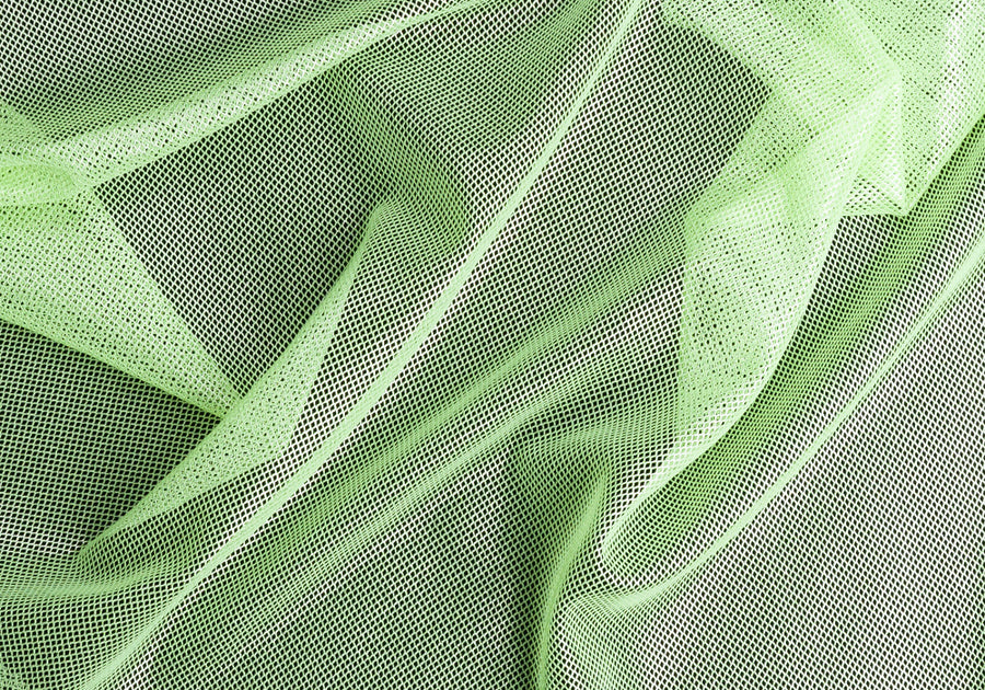 A high-end couture polyester mesh knit, fresh cucumber green, drapey, and finished with a metallic silver glimmer - perfect for a frisky wrap dress or a cowl-neck top. Made in Italy. 70% poliamide, 20% polyester, and 10% lycra blend. 53" wide.