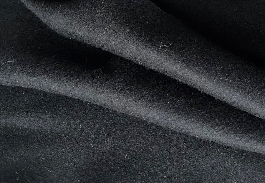A mid-weight, classic brushed wool and cashmere blend Melton coating in chic jet black - excellent for cozy coats and jackets. Made in Italy. 80% wool and 20% cashmere blend. 59" wide.