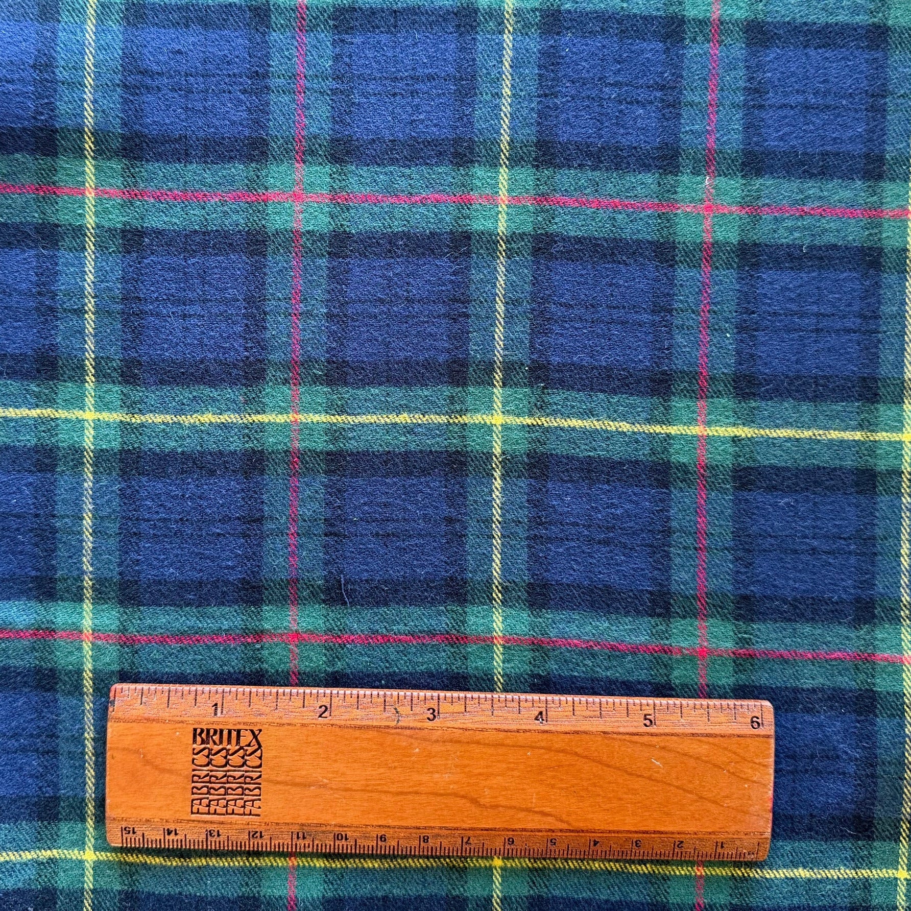 A soft cotton flannel shirting in a navy and pine plaid , with yellow and red accents - this cozy, brushed cotton is perfect for a blouse, nightwear, or a shirt. 100% cotton. 56" wide.