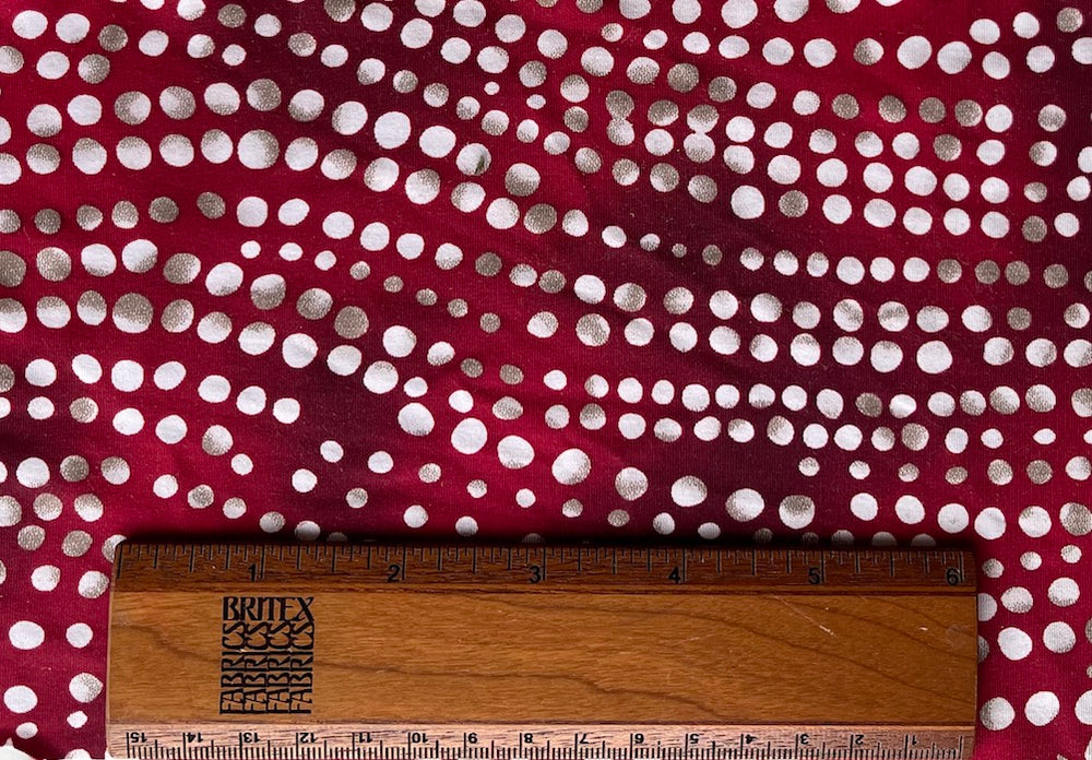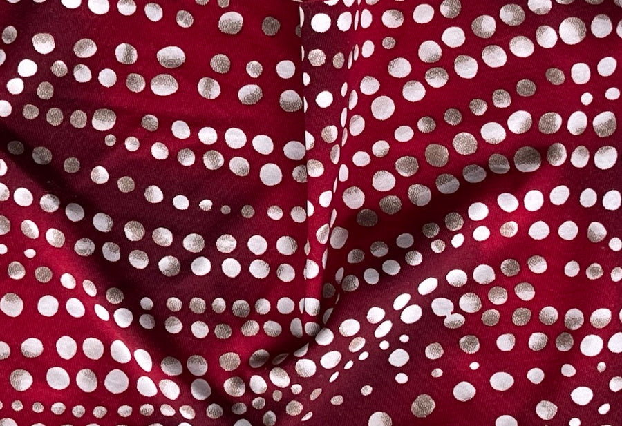 A swimsuit knit fabric in a delightful print of white and beige polka dots dancing on a cranberry background - perfect for swimwear at the pool, sportswear, tops, costumes, or lounging at the beach! 80% nylon and 10% lycra. 60" wide.