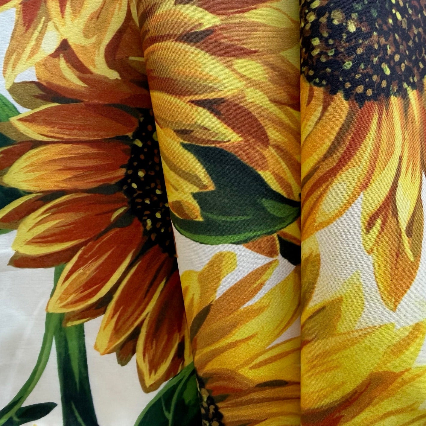 A couture crisp cotton poplin print of splendid over-sized sunflowers on a white background - this summery, smooth print is perfect for blouses, sundresses, and shirts. Limited yardage. Made in Italy for D&G. 100% cotton. 59" wide.