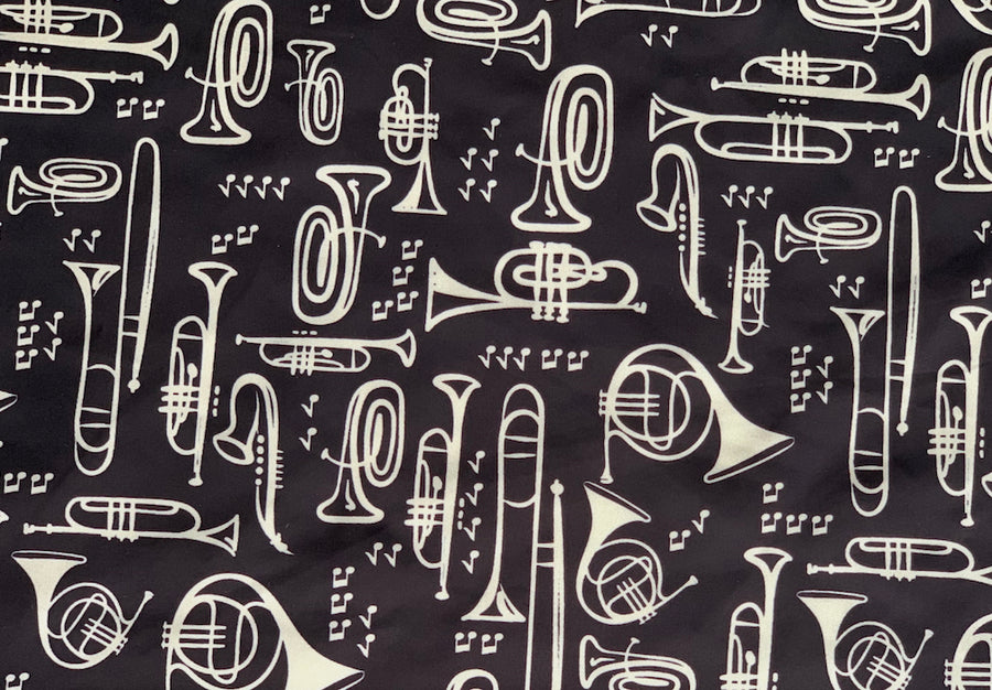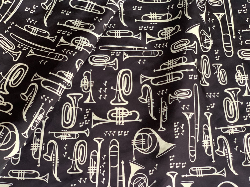 A water resistant polyester in a charming print of horn instruments and musical notes in off-white on a black background. This fabric is light-weight and strong - perfect as a protective bag for musical instruments, a rain cape, or a summer raincoat! Made in Italy and used by D&G. 100% polyester. 60" wide.