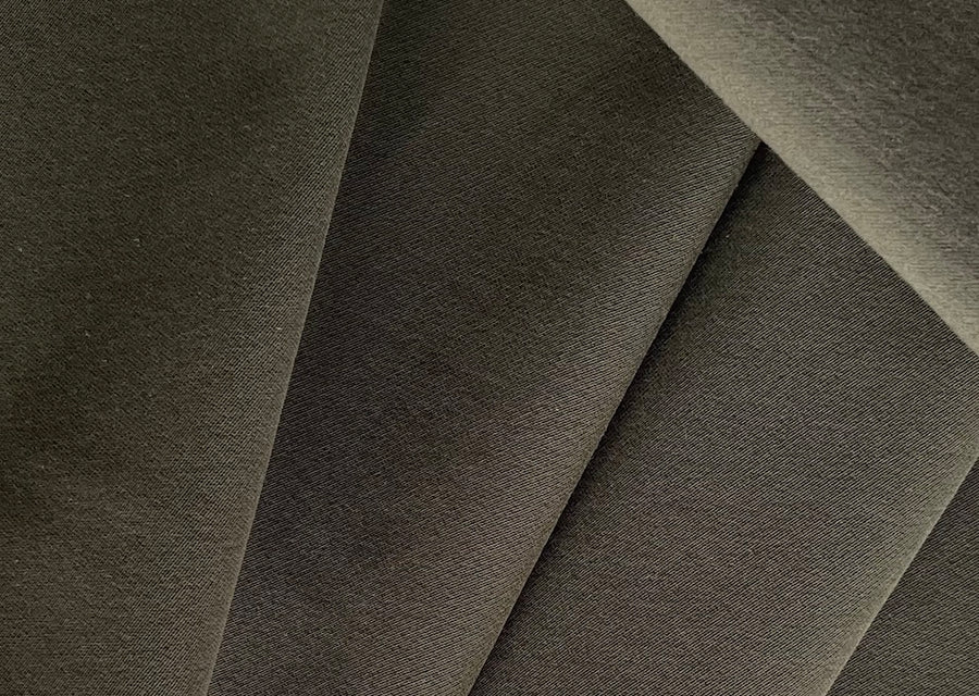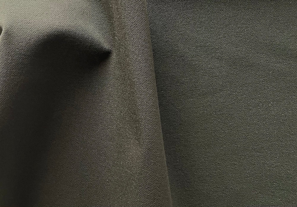 A polyester blend calvary twill with a cotton flannel backing in dark olive green - water-resistant and tightly woven, this midweight twill has a touch of lycra, looks like fine wool, and is perfect for travel wear...make a trench coat a jacket. Made in Italy. 52" wide. Polyester, cotton, and lycra blend.