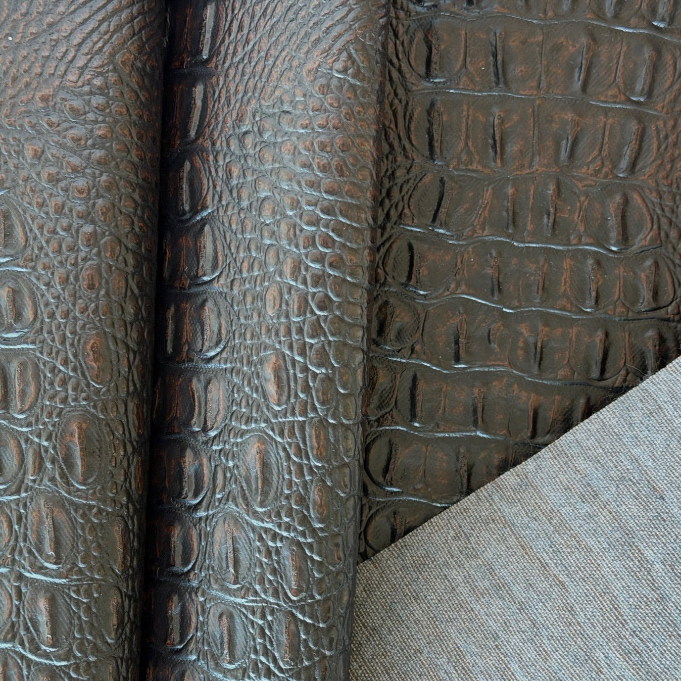 A mid-weight mock crocodile backed vinyl in shades of deep brown - this stiffer imitation leather is perfect for car or home upholstery, headboards, dining room chairs, or ottomans. Wipe down with water. Made in USA. 55" wide.