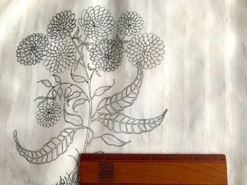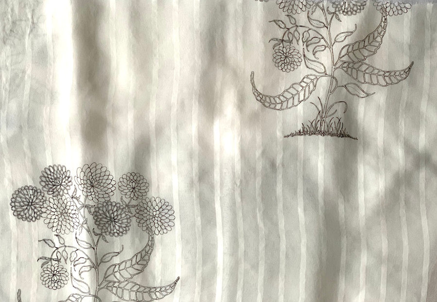 A semi-sheer silk chiffon, with a beautiful, gossamer, etching-style floral print and a tone-on-tone soft white satin stripe background - great for a wrap, a vintage-style blouse, or a kimono-sleeved jacket. Made in Italy. 100% silk. 52" wide.