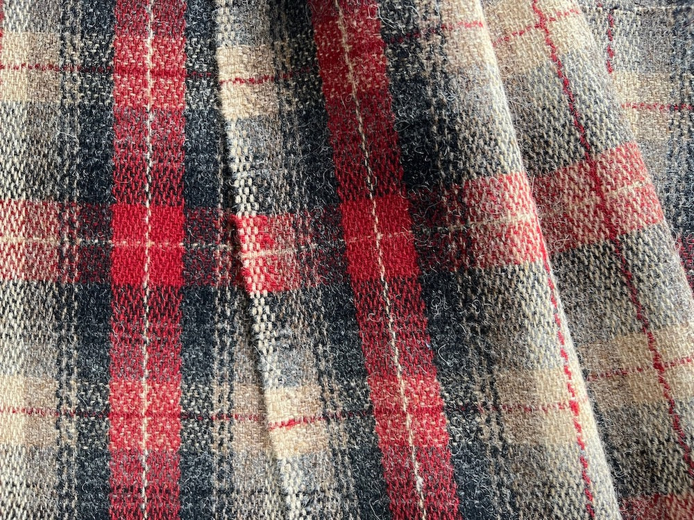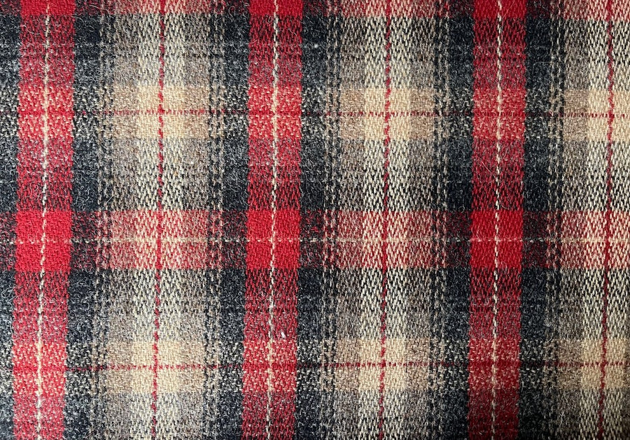 A mid-weight wool in a delightfully rustic carmine, mushroom, charcoal, and black plaid - perfect for outdoor jackets, coats, throws, billowy pillows, or rugged wear. 100% wool. 59" wide.