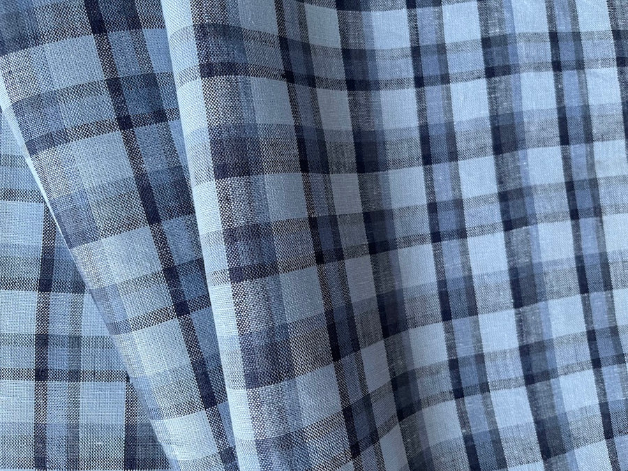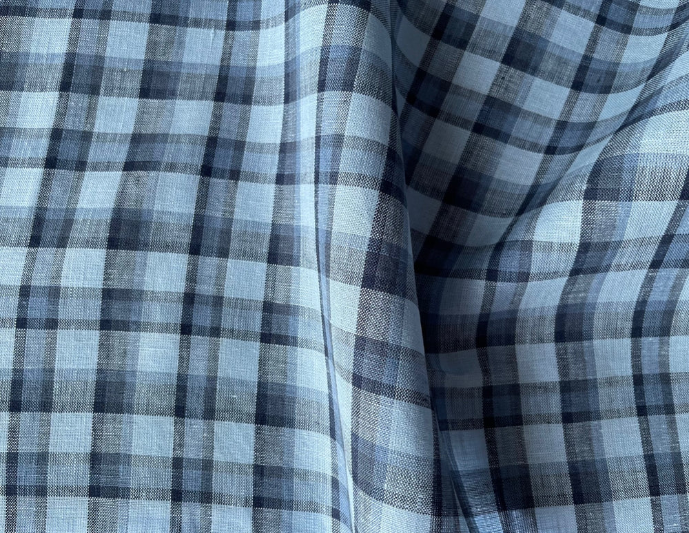 A wonderful linen smaller-scale plaid in muted shades of denim, navy, and sky blue - this mid-weight, classic linen is perfect for pants, dresses, culottes, or a jacket. Made in Poland. 100% linen. 60" wide.