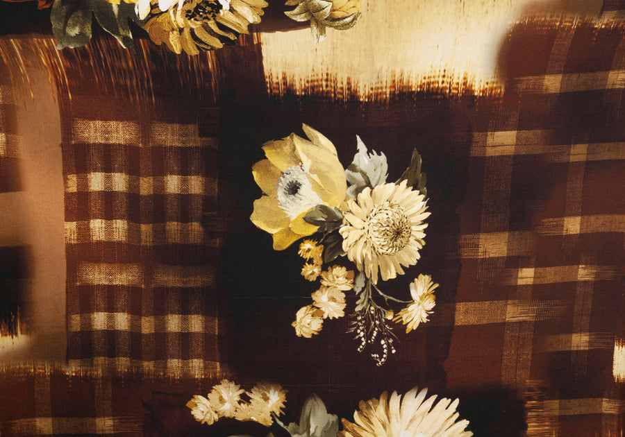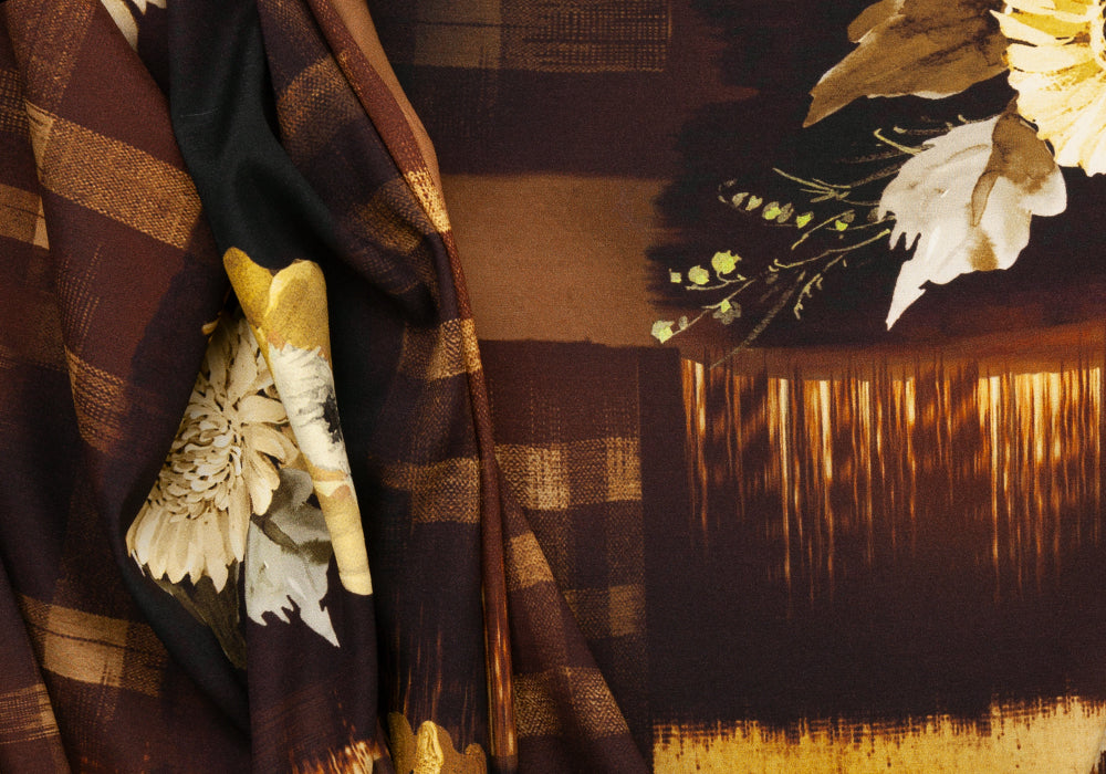 A printed silk charmeuse in a 9" floral print, on a plaid background in shades of rich brown, with three floral motifs per width - fabulous for a blouse or an elegant dressing gown. Made in Italy. 96% silk and 4% lycra. 54 wide.