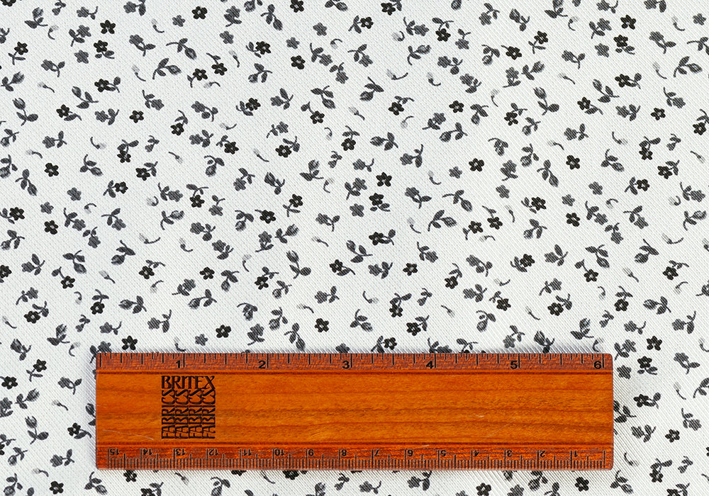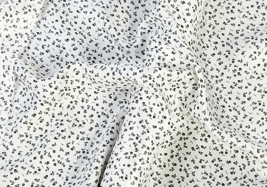 A designer blouse-weight silk twill with a slight sheen, a small floral print in neutral blacks and grey on a white background - divine for a blouse or a summer frock. Made in Italy. 100% silk. 55" wide.