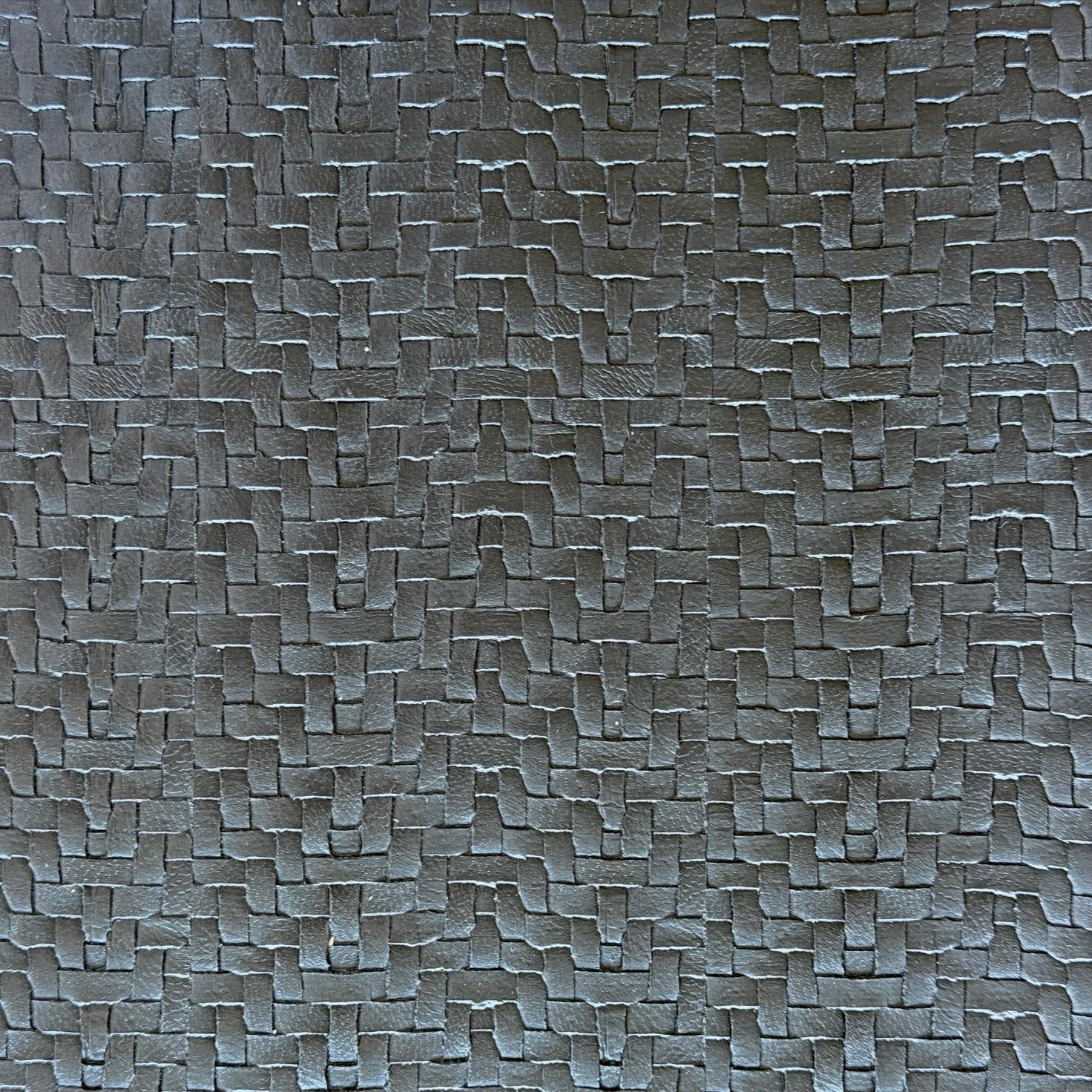 A mid-weight irregular geometric basketweave backed vinyl in ebony black - this stiffer imitation leather is perfect for car or home upholstery, headboards, dining room chairs, or ottomans. Wipe down with water. Made in USA. 55" wide.
