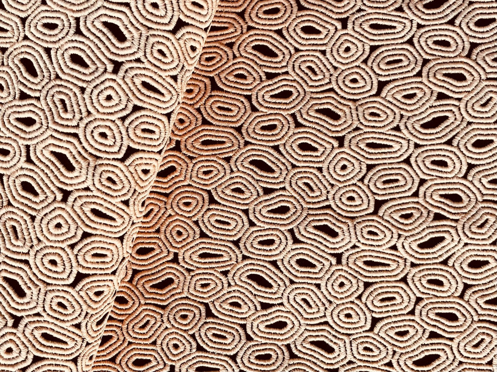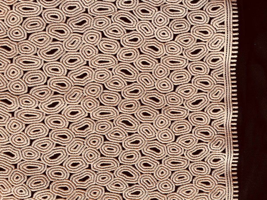 A couture viscose blend crepe embroidered with light cappuccino ringed pod shapes - this beautiful, heavy, and sophisticated fabric would make a magnificent evening cloak, elegant vest, or stunning skirt. Made in Italy and used by a high-end designer. Viscose base and cotton embroidery blend. 53" wide.