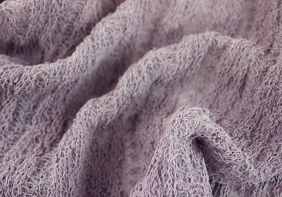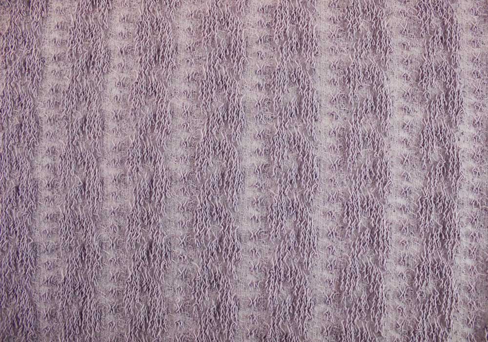 An amazing cotton knit in romantic lavender, with a loose cable weave mounted on mesh, this fabric has the luxurious look and feel of a tailored knit lace. This unique knit would make a stunning strapless evening gown or a sophisticated jacket. cables run lengthwise. 52" wide. Cotton and nylon blend. Made in Japan.