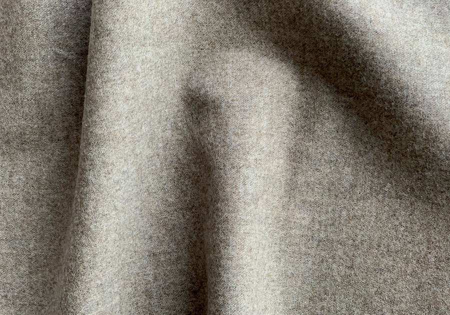 A wool and cashmere blend flannel in a heathered mouse beige - this lovely light to mid weight classic handling flannel is superb for slacks, a suit, or a tunic. Made in Italy and used by F. Filippi. 85% wool and 15% cashmere. 61" wide.