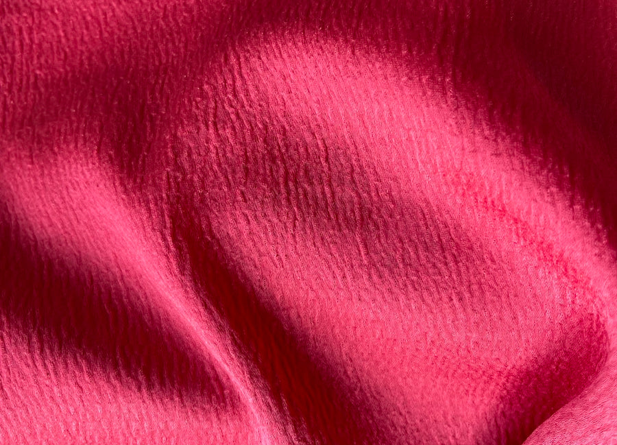 A crinkled, stretch polyester crepe-back satin in luscious flamingo coral - with a touch of lycra, this crepe-back satin is perfect for wide-legged pants or an asymmetrically hemmed sheath dress. Made in Japan. 80% polyester, 16% acetate, and 4% lycra. 45" wide.
