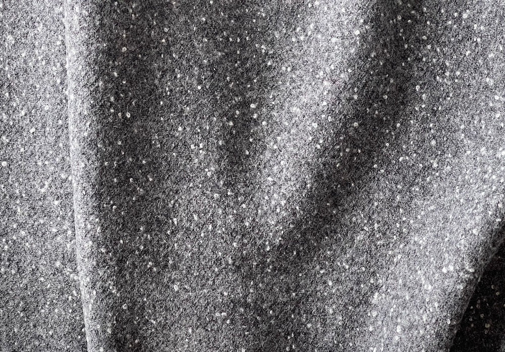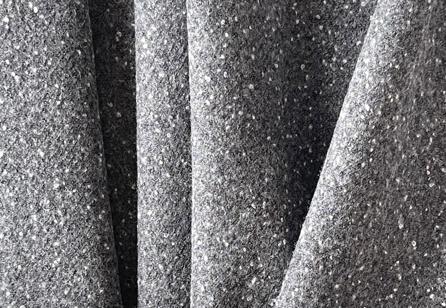 A stretch wool flannel in smoked mackerel grey with off-white flecks - with a knit-like feel, this drapey, brushed woolen is perfect for a softly styled dress, wide -eg pants, a jumper, or a jacket. Made in Italy. 98% wool and 2% lycra blend. 59" wide.