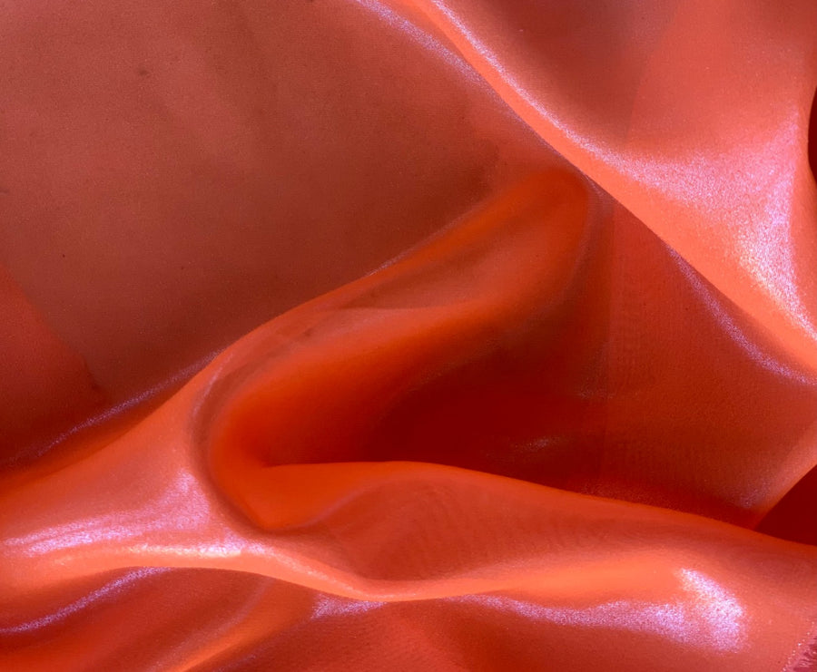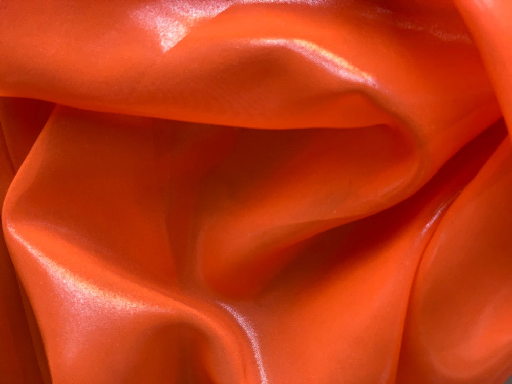 A semi-sheer liquid lame in a fluorescent orange  - this totally fun lame is perfect for an elegant blouse, draping, fun costumes, or scarfs. Made in Italy. Nylon and acrylic blend. 56" wide.