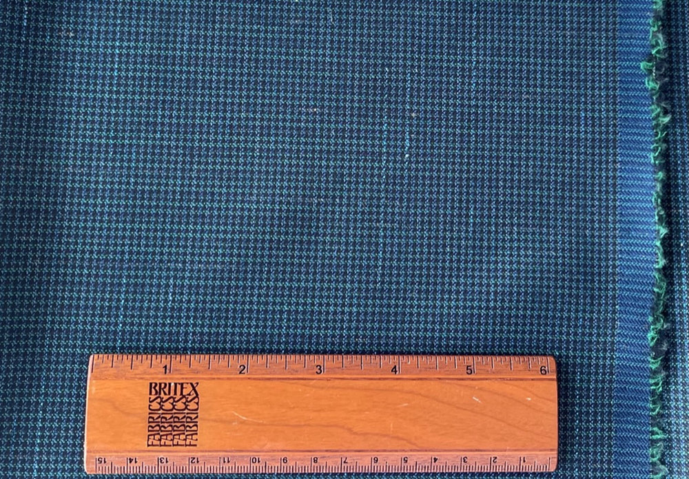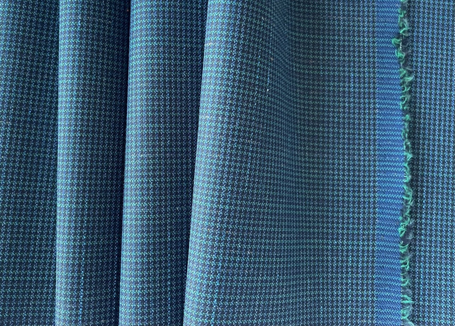 A tightly-woven wool jacketing in a navy, black, cobalt, and pine micro-check - this featherweight and smooth woolen is perfect for jackets, a light-weight sheath dress, or slim cropped pants. Made in Italy by a high-end mill. 100% wool. 61" wide.