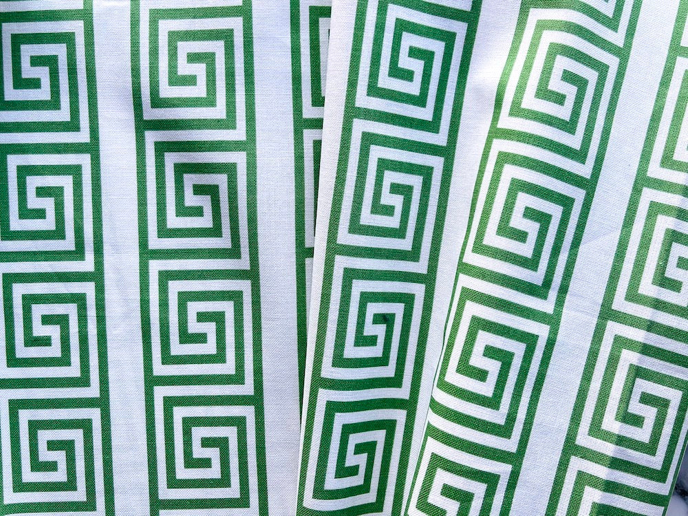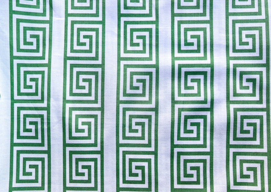 A cotton poplin in a golden yellow and white lengthwise Greek key print - smooth, soft, and luxurious, this is perfect for duvet covers, napkins, or a cool sheath dress. Made in Italy. 100% cotton. 60" wide.