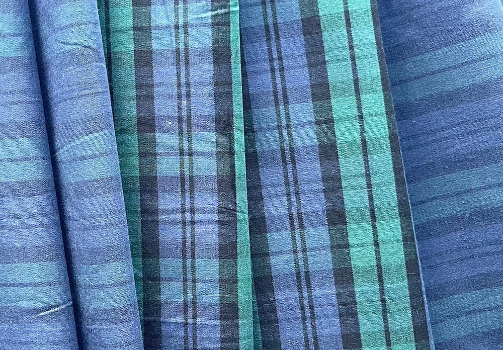 A cotton poplin shirting in a Black Watch plaid, intermixed with stripes; 15 1/2" wide plaid panels and 14 1/4" striped panels, all in shades of navy, black, and forest - this charming take on the traditional Black Watch is perfect for a terrific blocked shirt or loungewear. 100% cotton. 59" wide.