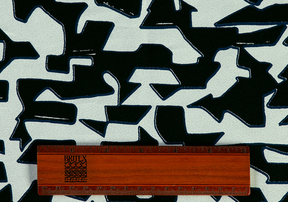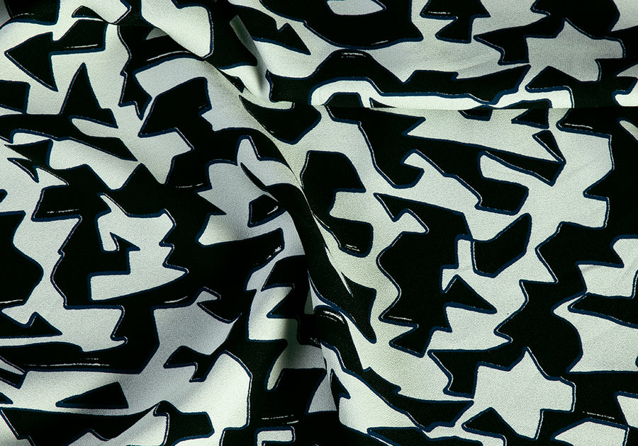 A midweight viscose georgette, with a print of geometric black and bright blue puzzle pieces on a pale mint green background - perfect for a sheath dress or a vintage-inspired blouse. Made in Italy. 58" wide. 100% viscose.