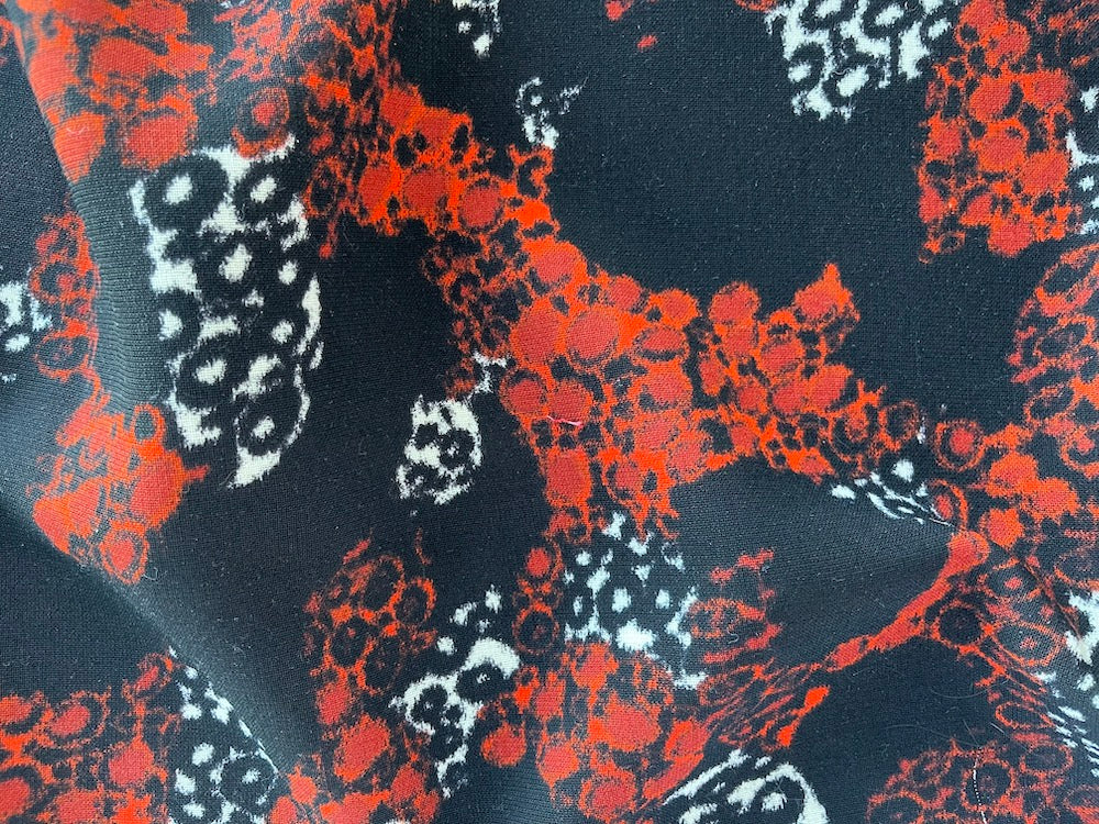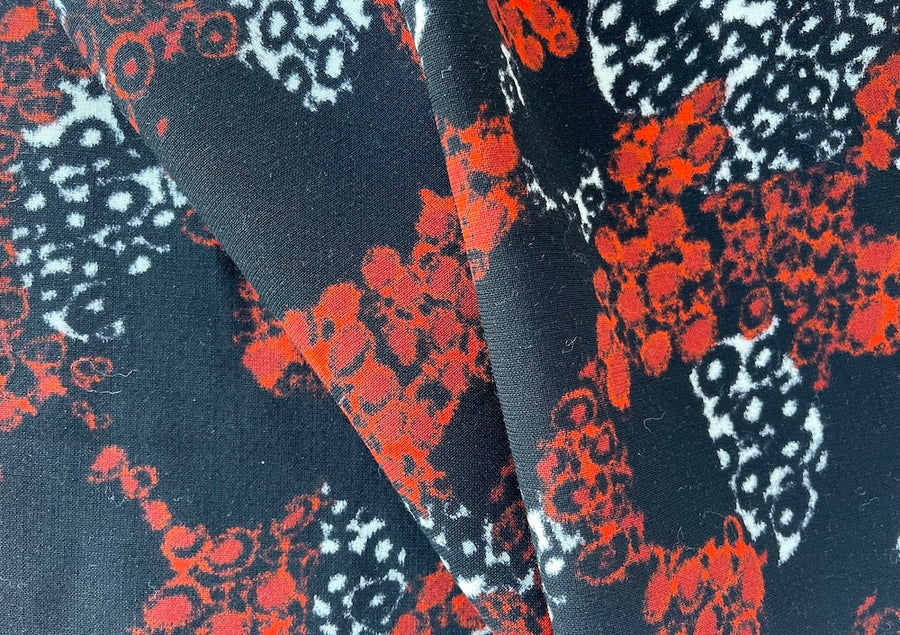 A mid-weight, couture wool in a snaky vermillion, black, and white print - this elegant fabric is perfect for a stunning maxi-skirt or a snazzy tunic. Made in Italy and used by Gucci. 100% wool. 58" wide.