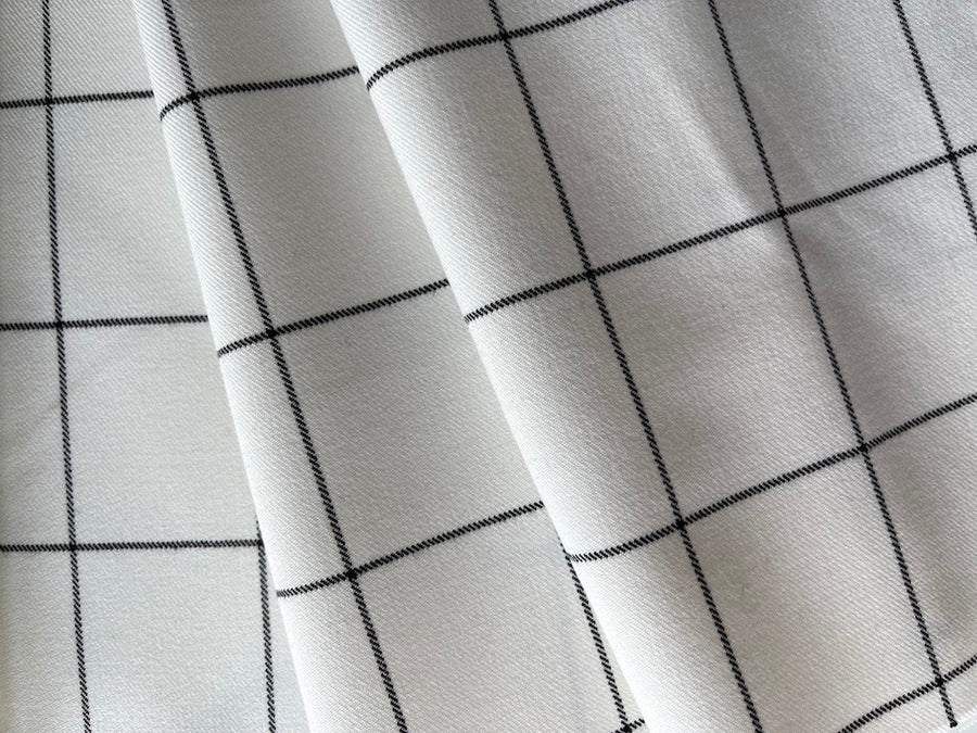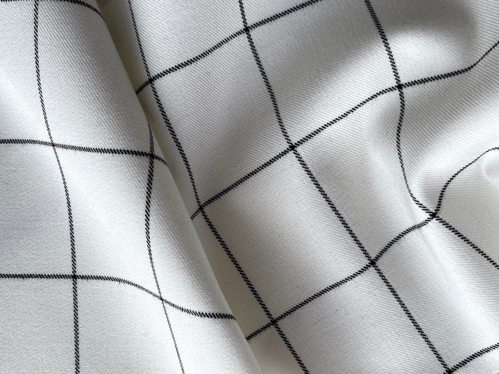 A mid-weight stretch wool in a handsome black and white windowpane plaid - With a touch of lycra, this soft and smooth wool is perfect for shirts, skirts, and pants. Made in Italy. 88% wool, 10% polyester, and 2% lycra. 54" wide.