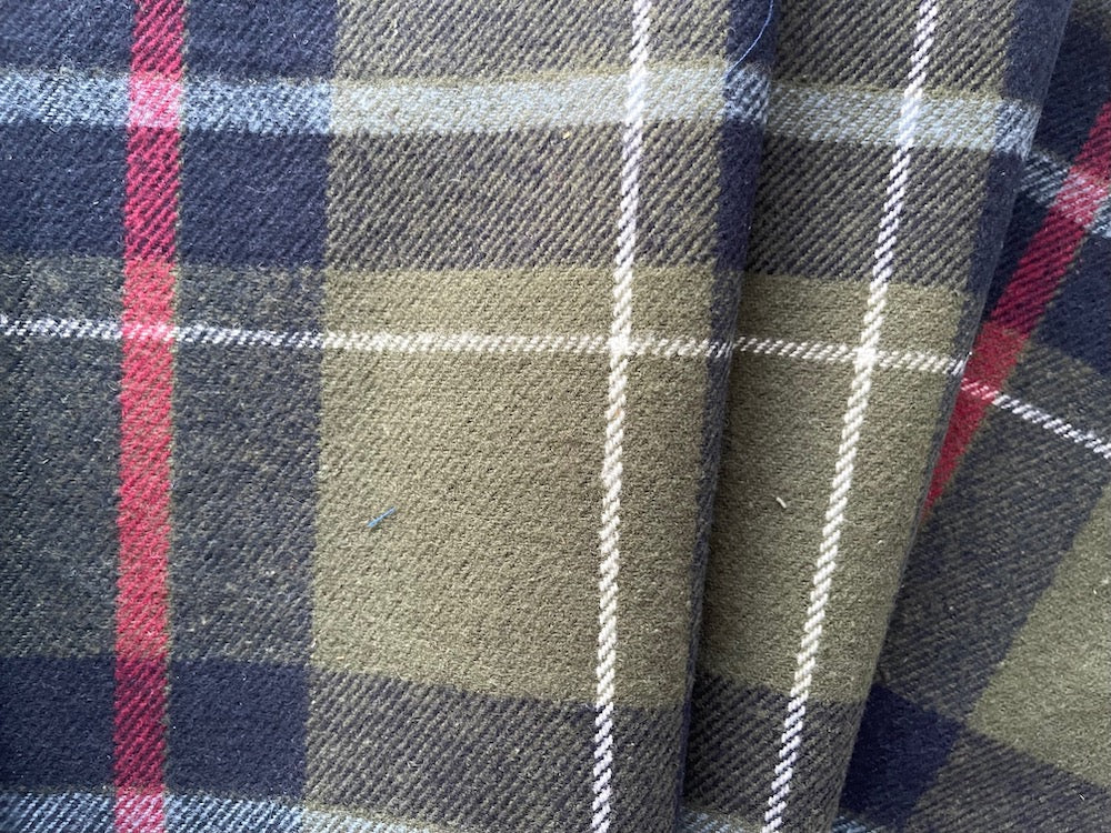 A heavier cotton flannel in a larger-scale plaid in shades of olive and midnight navy, with white and red accents  - with more body and thickness than typical flannel shirting, this flannel is perfect for bathrobes, outerwear, board shirts, or duvet covers. 100% cotton. 59" wide.