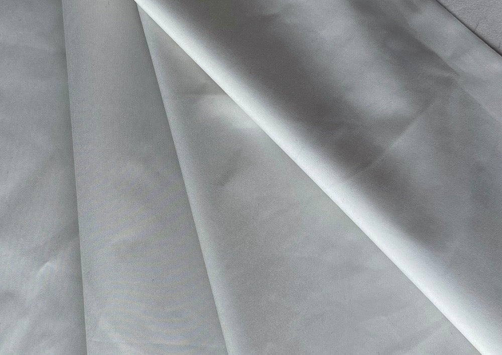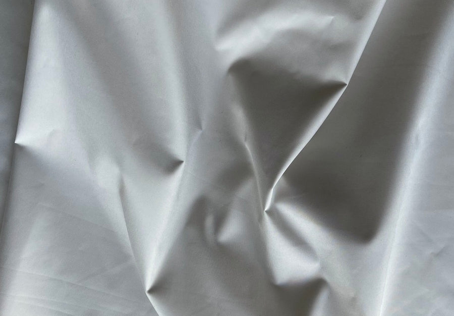 An elegant waterproof polyester rainwear fabric in cool bisque, and with a sueded back - this light-weight fabric is perfect for a trench coat, a jacket, or a cape. Made in Italy for Herno. 67" wide. 100% polyester.