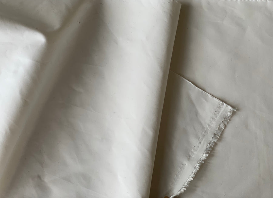 A lightweight polyester coating in a neutral, sueded oyster. Water-proof, this sporty fabric is perfect for a trench coat and rainwear. Made in Italy and used by the house, Herno. 59" wide. 100% polyester.