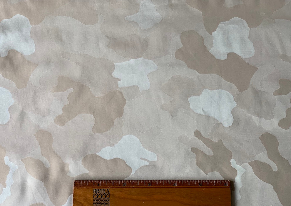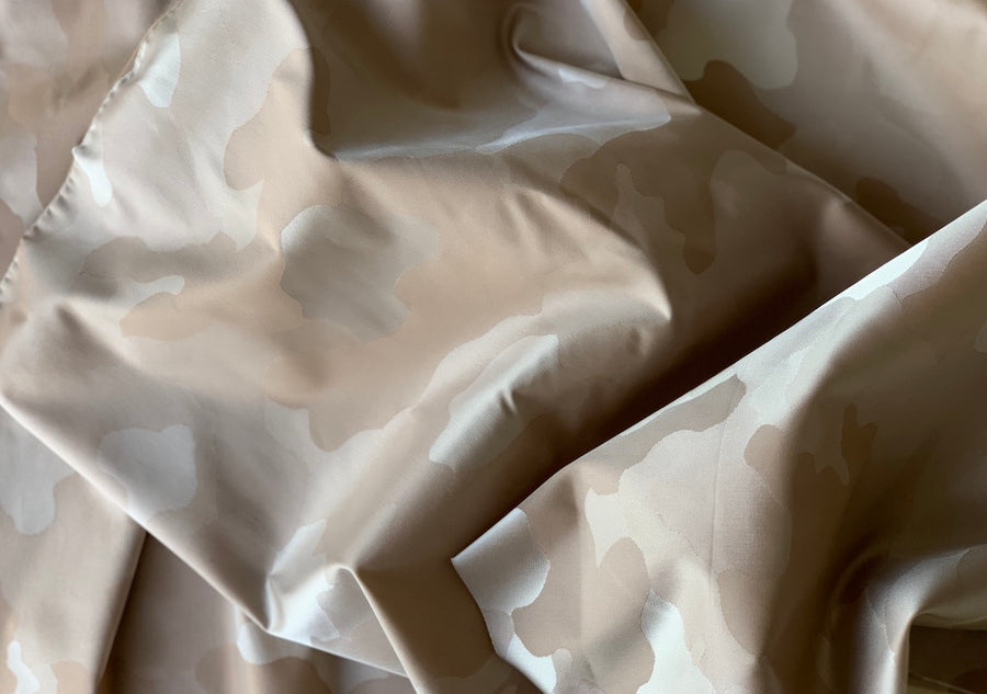 A lightweight polyester fabric in a soft beige cameo print. Water-resistant, this sporty fabric is perfect for rainwear. Made in Italy and used by the house, Herno. 56" wide. 100% polyester.