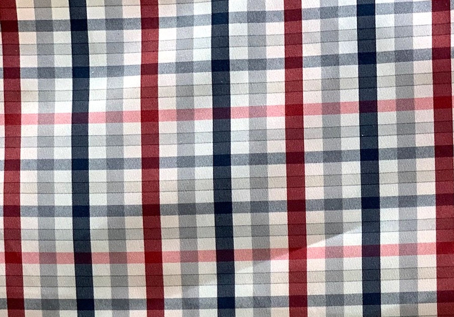 A designer water-resistant polyester rainwear fabric in a handsome plaid in shades of blue, grey, white, and wine - perfect for a trench coat, a jacket, or a cape. Made in Italy for Herno. 55" wide. 100% polyester.
