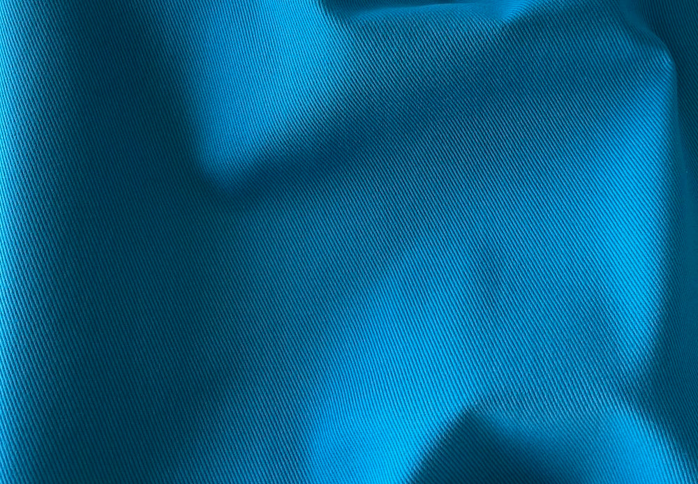 A high-quality water-resistant cotton twill gabardine in swimming pool blue - perfect for trousers, jackets, or raincoats. Made in Italy and used by Herno. 95% cotton and 5% lycra blend. 56" wide.