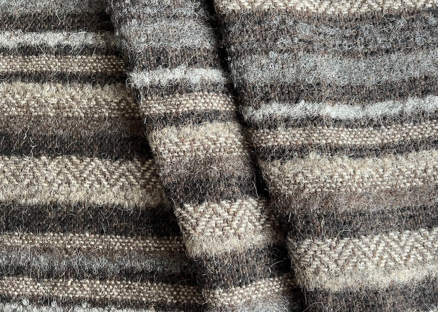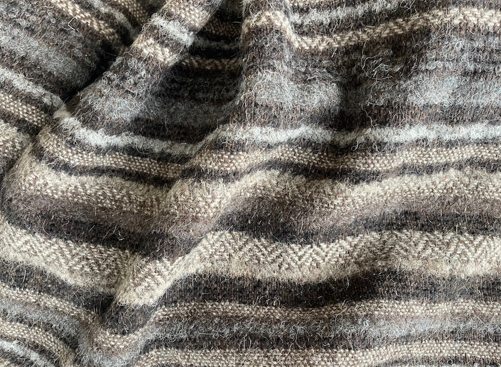 A luxuriously soft wool and mohair blend coating in a textured herringbone, tweed, bouclé crosswise stripe in cool shades of mahogany, mushroom, Oxford grey, and cream - this brushed, mid-weight coating is excellent for amazing overcoats, warm jackets, vests, or cozy sofa throws. Made in Italy. Wool and mohair blend. 52" wide.