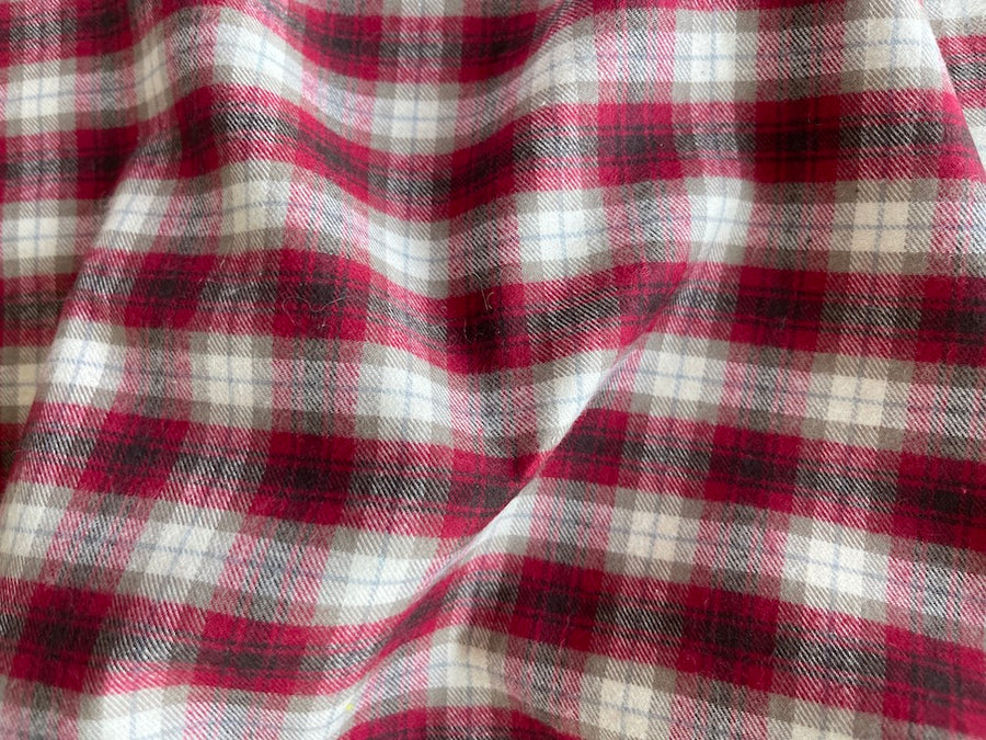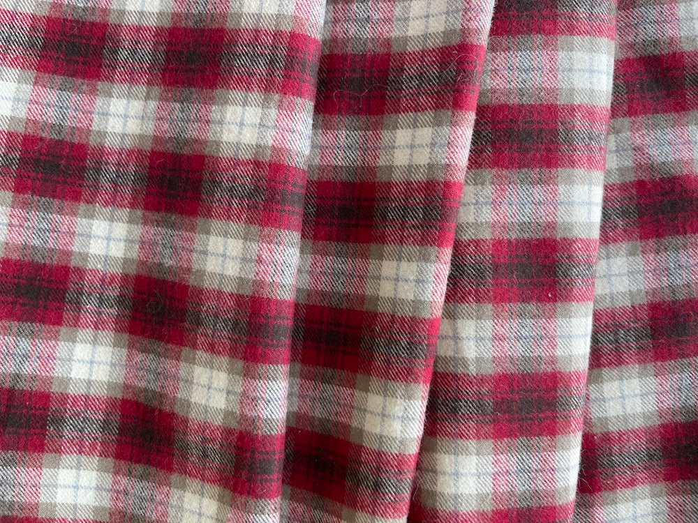A high-end, brushed cotton shirting in a woven plaid in cranberry, cool mouse brown and ivory - this tightly-woven shirting is perfect for shirts, a duvet cover, or pajamas. Made in Italy. 100% cotton. 55" wide.