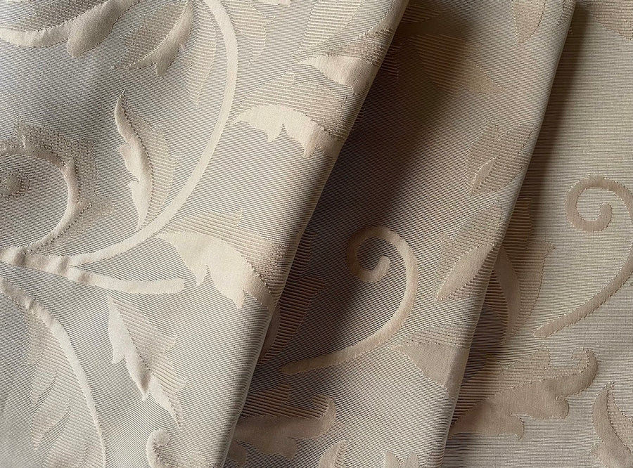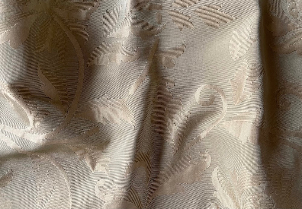 A high-end silk blend jacquard brocade adorned in a gold sandy beige Arabesque design - this luxuriously romantic fabric is perfect for dining room chairs, pillows, upholstered headboards, or an élégant evening suit. Made in India. 73% silk and 27% cotton blend. 56" wide.