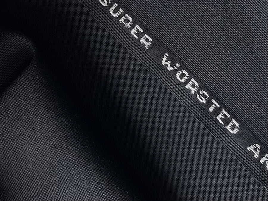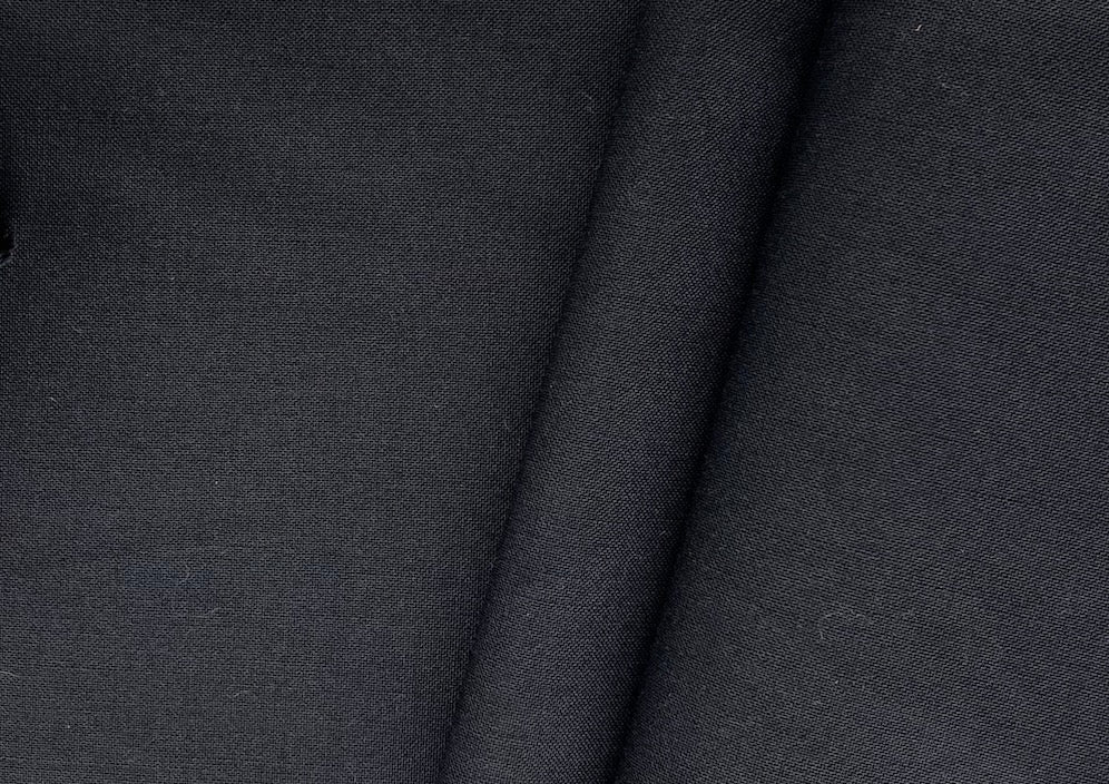 A fine, worsted wool and mohair blend suiting in elegant matte black. This high-end, handsome suiting is perfect for tailoring -- make a suit or pleated slacks. Made in England. Wool and mohair blend. 58" wide.
