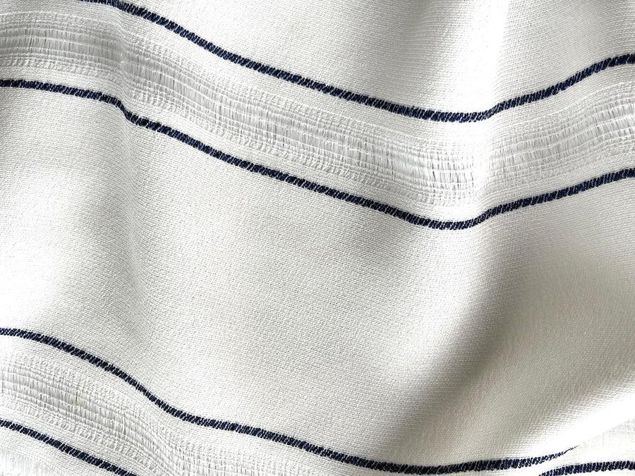 A fresh, semi-sheer rayon viscose blend crepe in midnight navy blue stripes against a variegated textured white background - this airy, summery viscose is perfect for lined wide-legged palazzos or a vintage-style blouse. Made in Italy and used by high-end designer. Viscose and acetate blend. 38" wide.