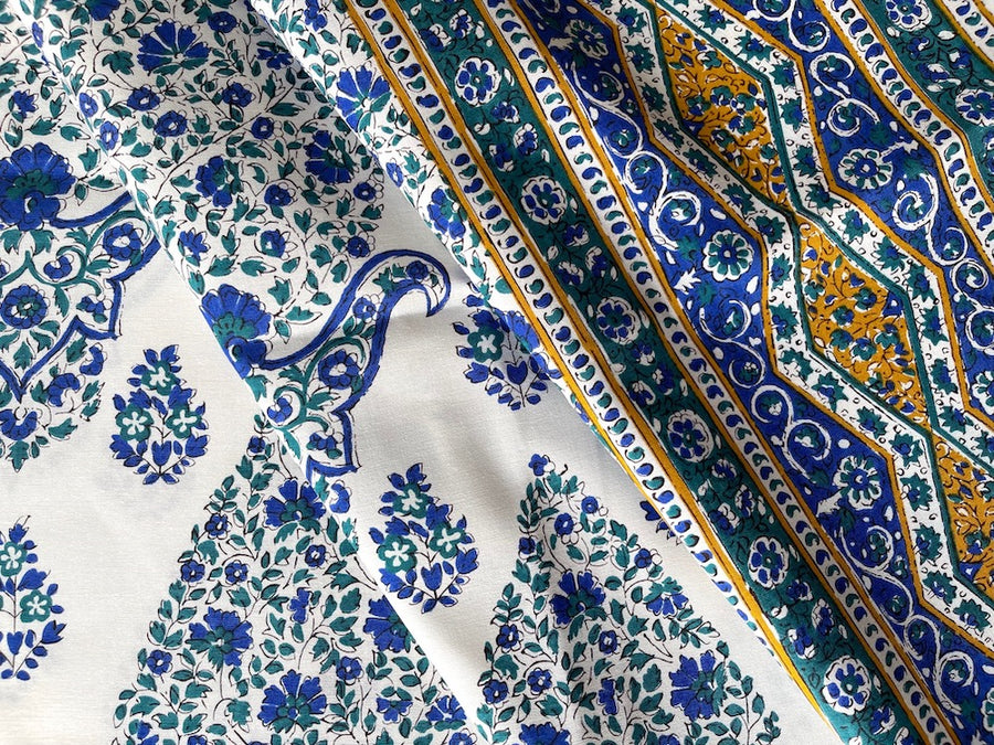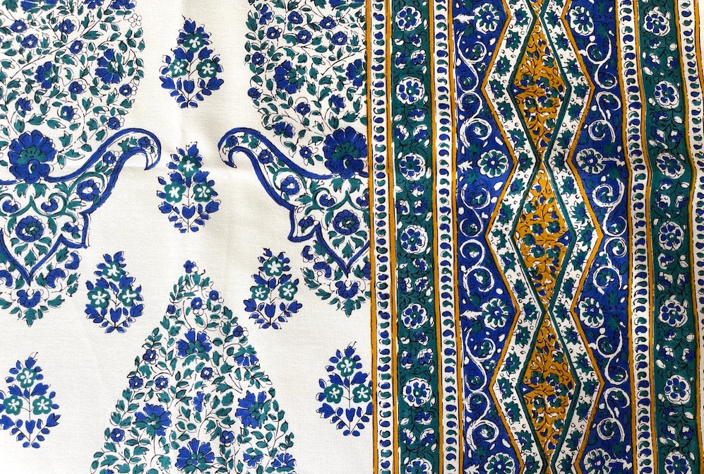 A Hill Brown cotton in a bordered, paisley Indian woodblock print in French provincial colors on a white background - with 8.5” borders, this vibrant cotton is perfect for table linens, lightweight slipcovers, pillows, duvet covers, or draperies. Made by Hill Brown. 100% cotton. 58" wide.