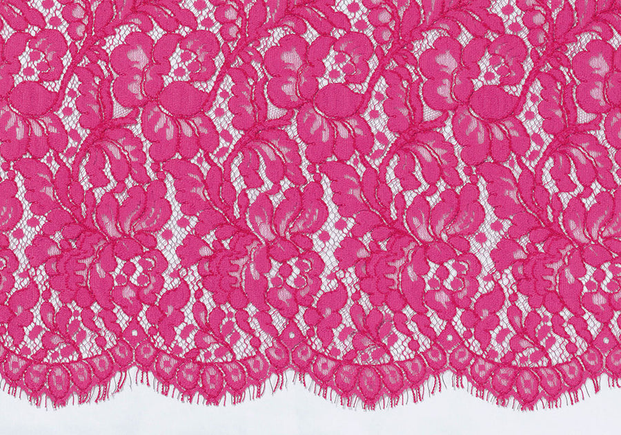 A hot pink Chantilly lace fabric - a floral design that's scalloped on both selvedges, with eyelash trim. Made in USA. 60% cotton, 17% poliamide, and 23% rayon blend. 42" wide.