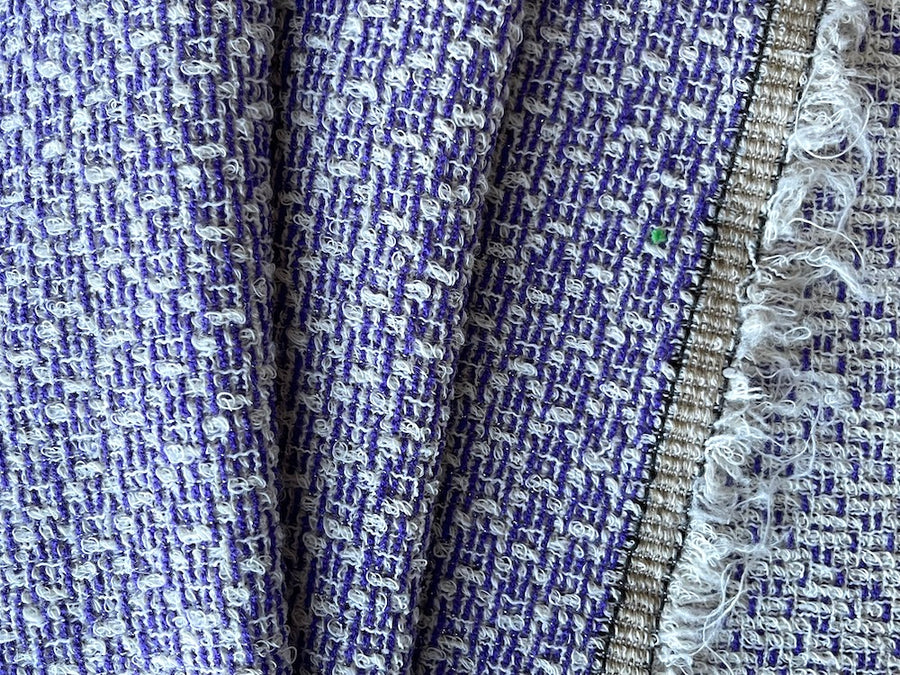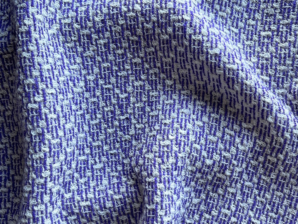 A loosely-woven wool blend tweed in a purpled sapphire and white multi-yarned, intricate weave - soft, supple, and fringeable, this is perfect for a French couture-style jacket, a sheath dress, or a sofa throw. Made in Italy. Wool and acrylic blend. 56" wide.